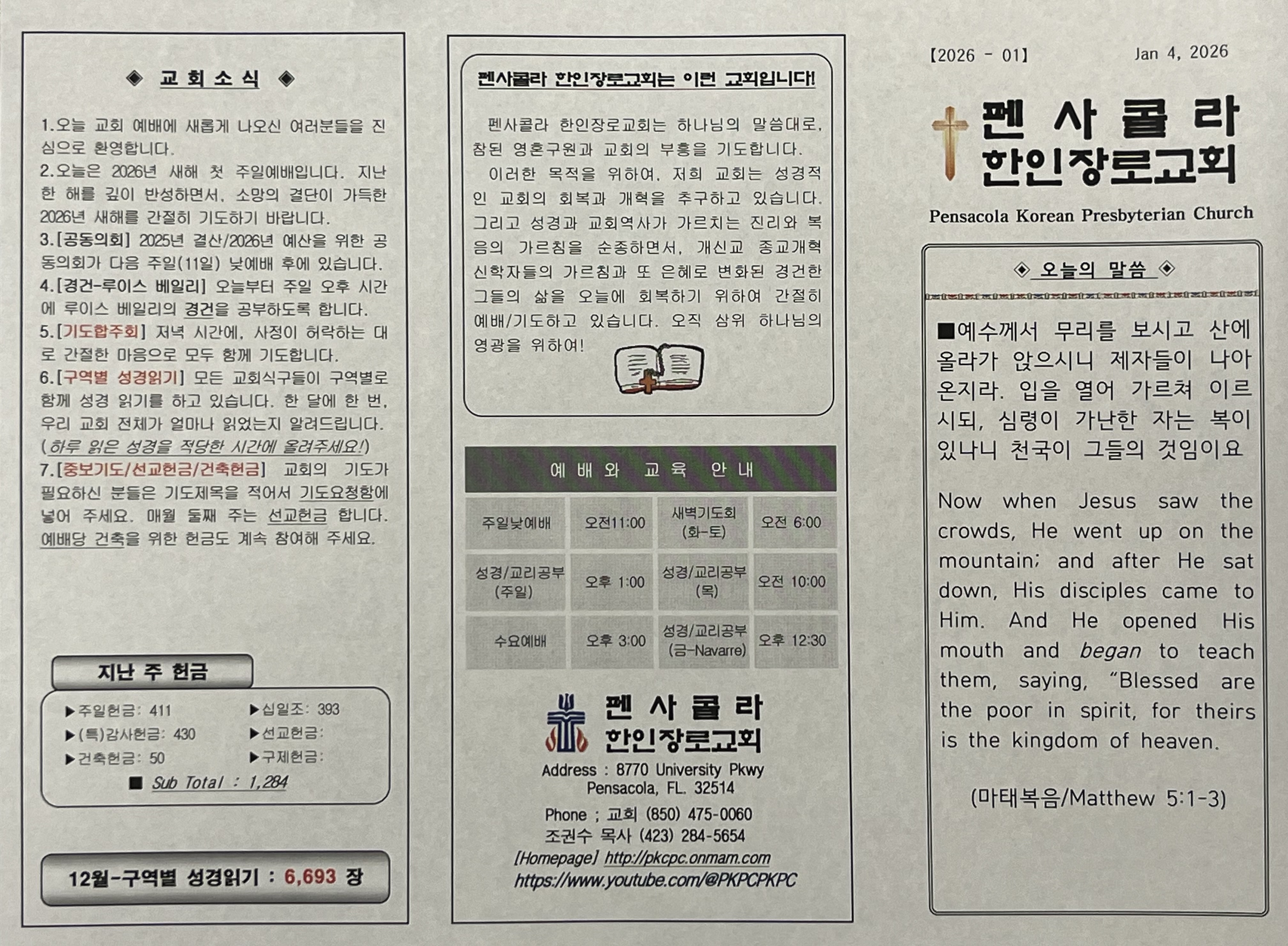 2026년 1월 4일, 교회 주보입니다.