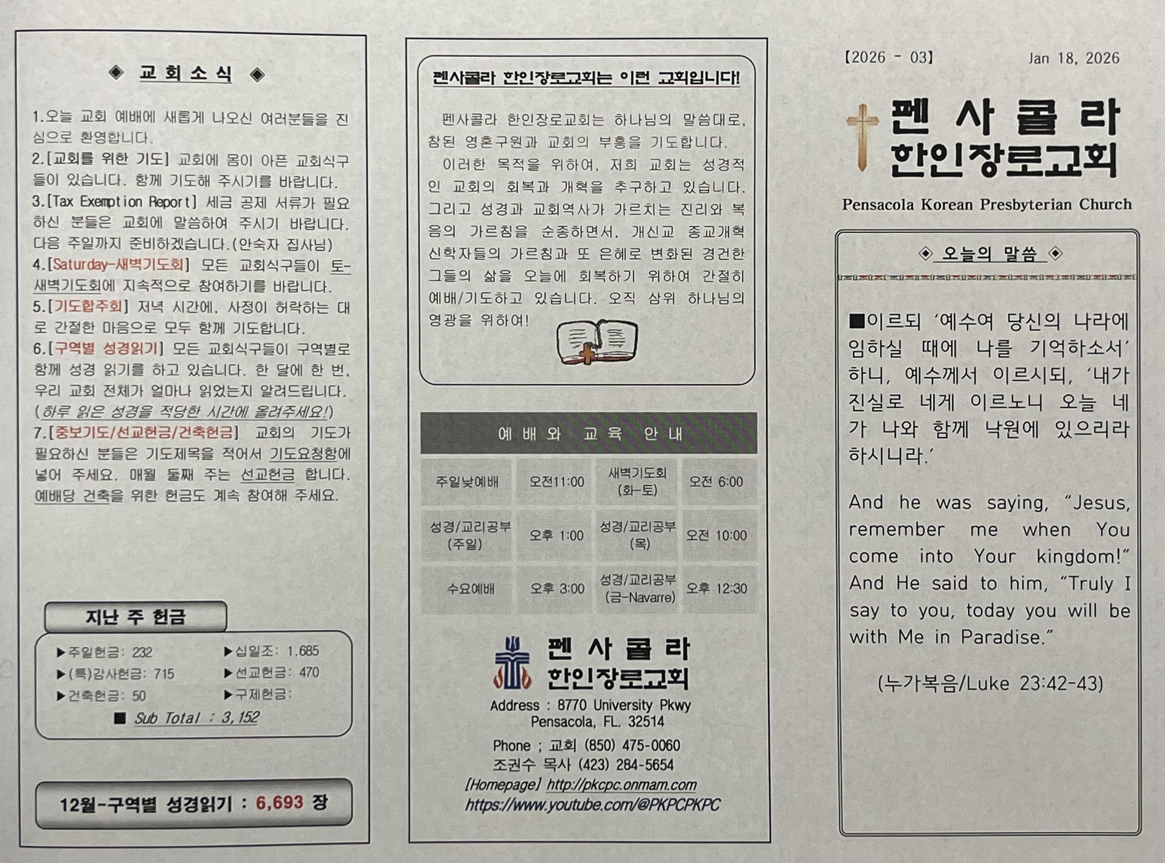 2026년 1월 18일, 교회 주보입니다.