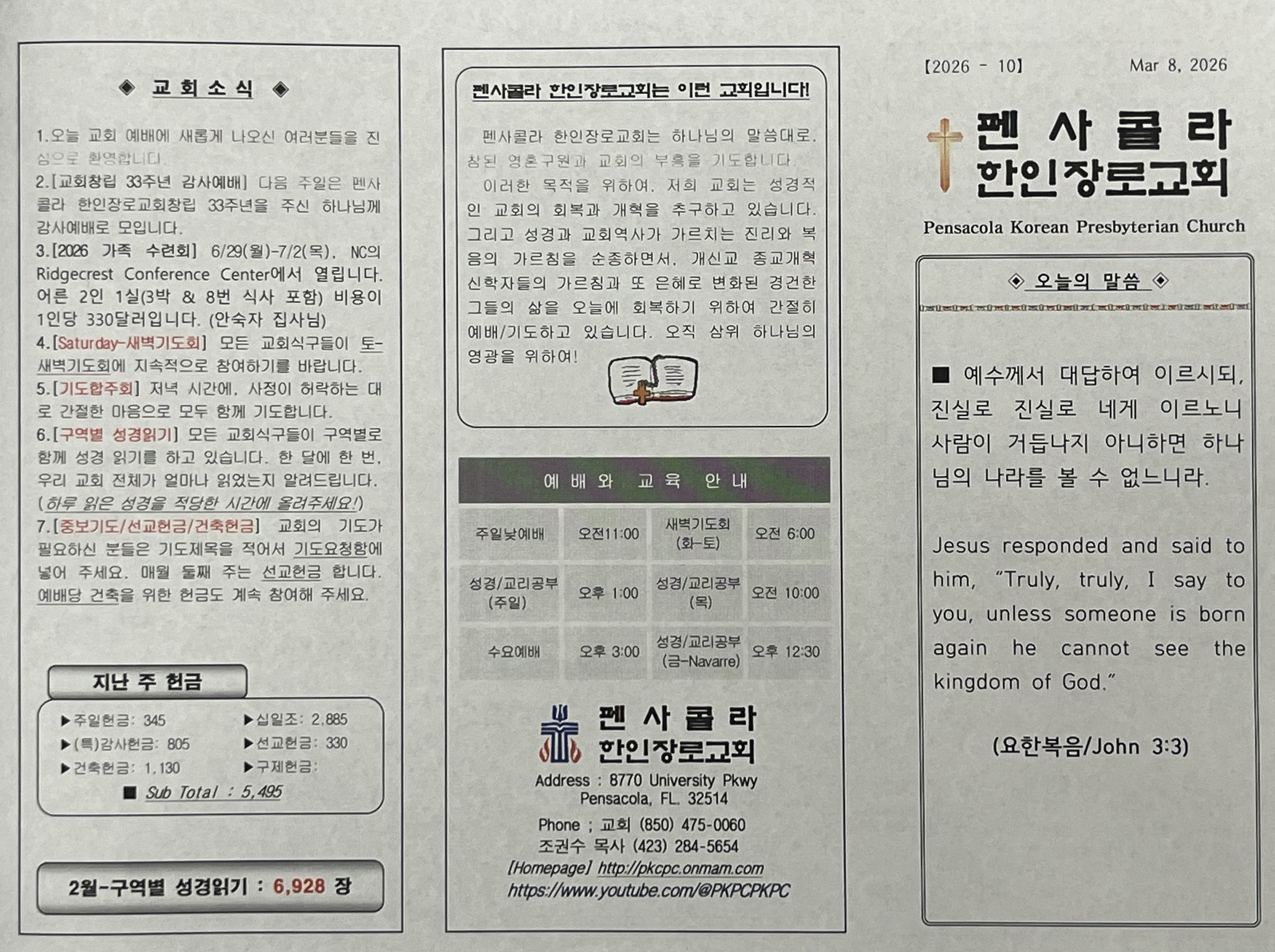 2026년 3월 8일, 교회 주보입니다.